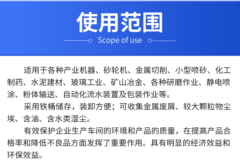 采用铁桶储存,装卸方便;可收集金属废屑、较大颗粒物尘埃、含油、含水类湿尘。